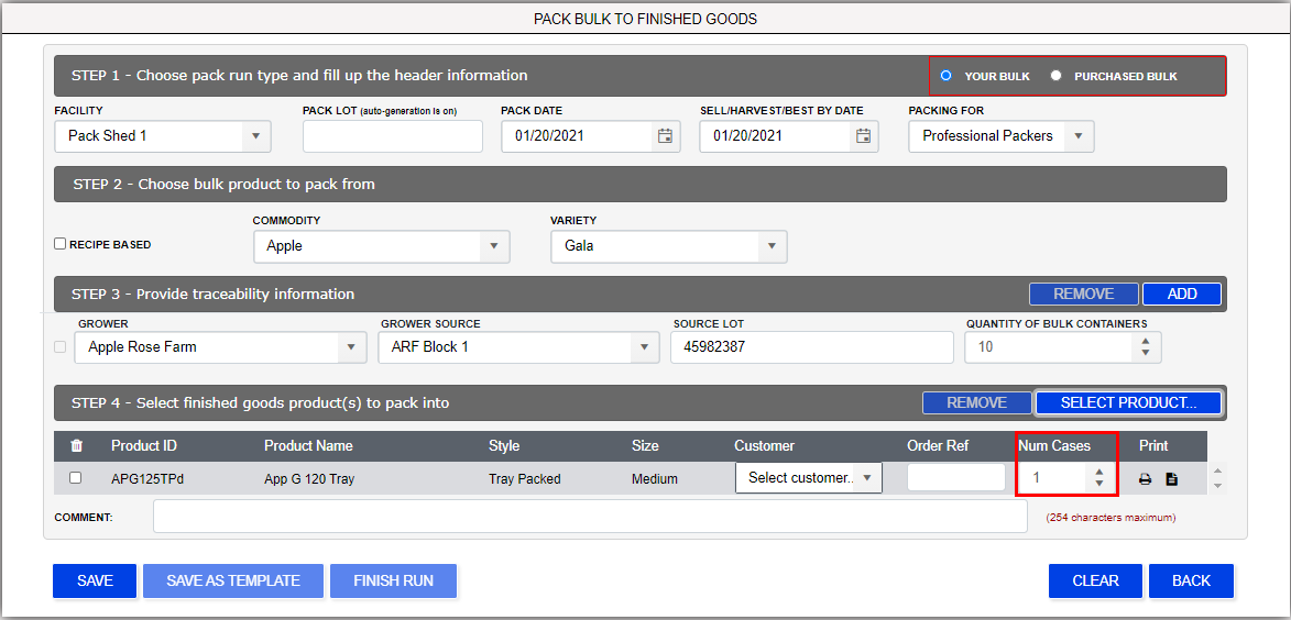A Pack Run Template is an efficiency tool. If you find you pack the same produce from the same source, you may create a template. Open the template and change the particulars in the pack lot, date, grower, source, source lot fields. Save the pack ...
