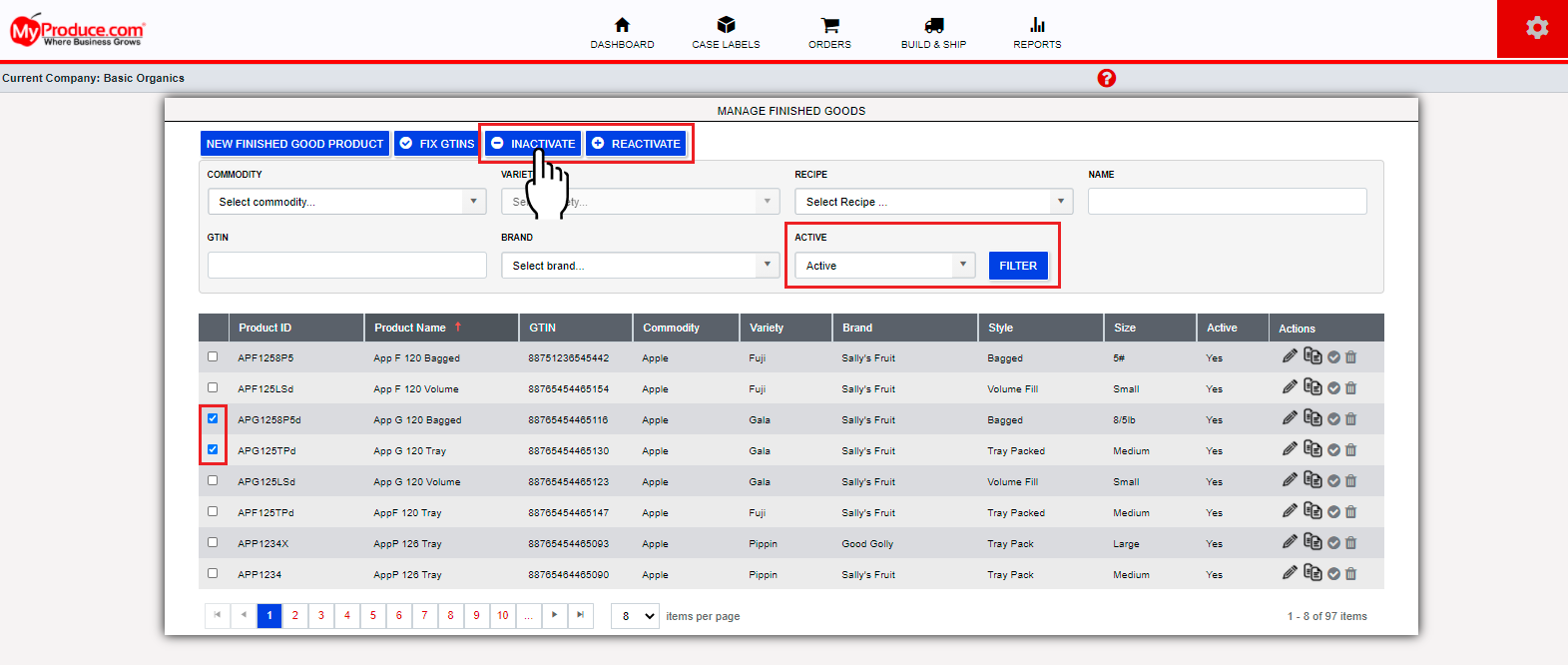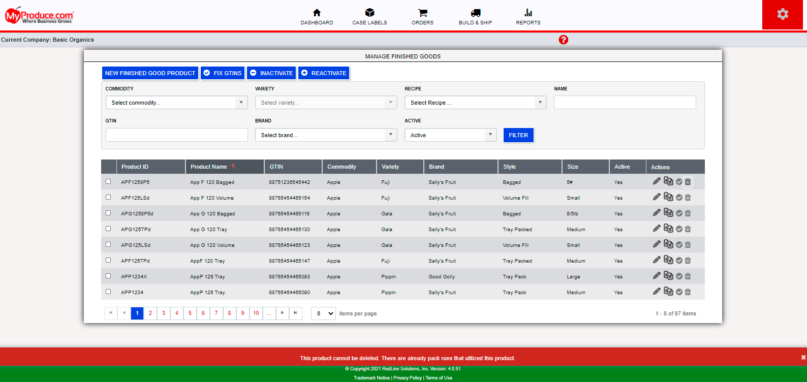 A Finished Good Product deletion error notification displayed at the bottom of the screenYou can also Activate and Inactivate Finished Good Products, which will hide or unhide them in the system. This can be done by clicking the check box next to the finished goods product(s) and clicking the Inactivate or Reactivate buttons. If reactivating a product, be sure that the Active filter is set to Inactive or All Items in order to be able to see the items that are currently inactive.