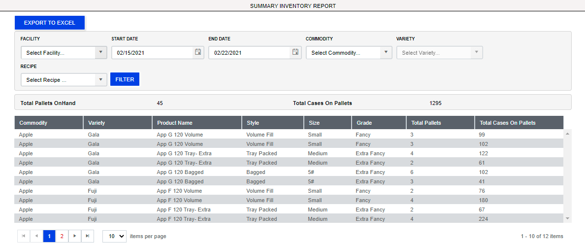 Summary Inventory can be filtered by facility, start and end dates, commodity, variety, and recipe.