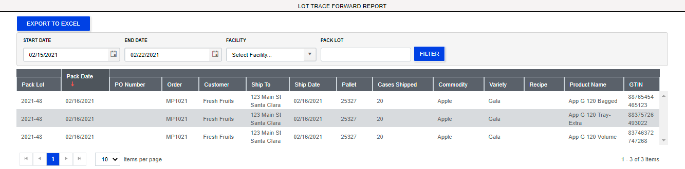 Lot Trace forward allows filtering by start and end date, facility, and pack lot.